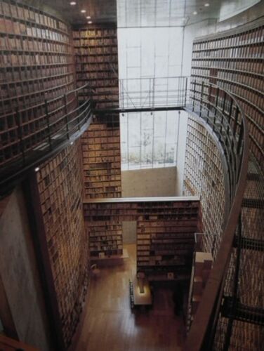 前回から取り上げているのは大阪にある「司馬遼太郎記念館」のイメージ書斎安藤忠雄さんの手になるものだ。実際司馬さんのご自宅には4万冊の蔵書があったそうで記念館では約2万冊の蔵書を三層吹き抜け(約11メートル)の壁面を利用した書棚に収納している…